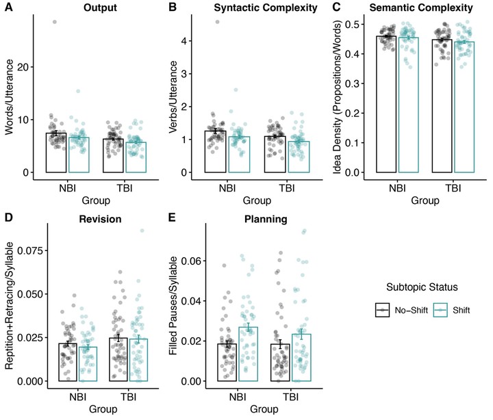 Individuals with traumatic brain injury (TBI) often report difficulties with following conversation topics. It remains unclear how healthy adults manage topic shifts, making it difficult to determine why these abilities break down after TBI. We analyzed conversations from healthy adults and TBI patients, identified topic boundaries, and compared responses following new subtopics (“shift”) versus continuing subtopics (“no shift”) using measures of language production. Across groups, post-shift responses were shorter and simpler (fewer words, verbs, and instances of repetition or rephrasing) and required more planning (more filled pauses), reflecting “shift costs”. TBI patients produced overall shorter and syntactically simpler responses, though shift costs did not differ between groups. Within the TBI group, more severe injuries were associated with smaller shift costs, possibly reflecting reduced sensitivity to topic structure. These findings suggest that the cognitive demands of tracking topic changes affect language production and that these effects are modulated by injury severity.
