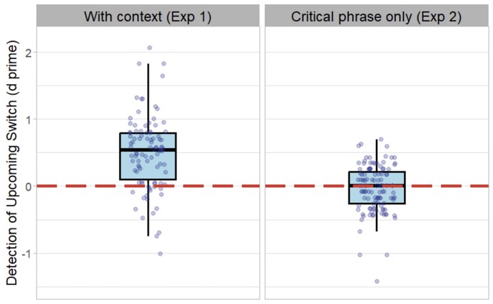 Language comprehension involves prediction, but what exactly can comprehenders predict? We ask if bilinguals can consciously predict upcoming code-switches between languages. If predictions focus on a sentence’s message, then listeners should not predict code-switches, which alter the language used but not necessarily the meaning. Alternatively, if listeners predict at many levels—including language—then they may predict code-switches. Here, we selected sentences from a corpus of spontaneous bilingual conversations that started in Spanish and removed the final word that would have continued in Spanish or code-switched to English. In two preregistered experiments, Spanish–English bilinguals heard these sentence fragments and predicted the language of the omitted final word. They successfully predicted upcoming code-switches when given 30 seconds of context prior to their predictions (Experiment 1; N = 94), but not when only hearing the sentence fragment (Experiment 2, N = 115). This shows that bilinguals can predict upcoming code-switches when sufficient conversational cues are available.