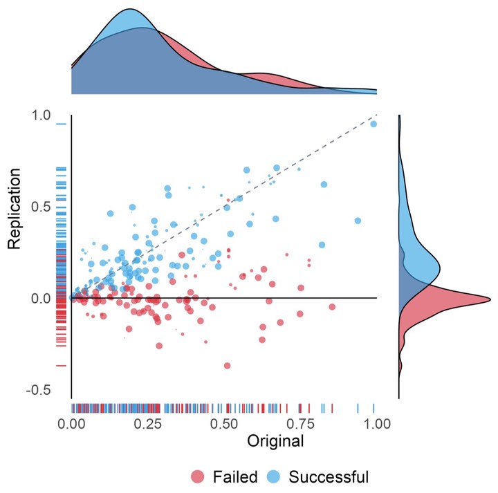 Full Citation: Tyner, A. H., Abatayo, A. L., Daley, M., Field, S., Fox, N., Haber, N. A., Hahn, K. M., Kline Struhl, M., Mawhinney, B., Miske, O., Silverstein, P., Soderberg, C. K., Stankov, T., Abbasi, A., Aberson, C. L., Aczel, B., Adamkovič, M., Albayrak, N., Allen, P. J., Andreychik, M., Awtrey, E., Axxe, E., Azevedo, F., Bader, M. D., Bago, B., Bailey, J., Bakker, M., Banik, G., Banks, G. C., Baskin, E., Batruch, A., Beatteay, A., Behr, S. M., Berente, N., Berry, Z., Białkowski, J., Bodroža, B., Boeschoten, L., Bognar, M., Bokhove, C., Bonfiglio, D., Bouwman, R., Brady, T. F., Braithwaite, S., Briceño Jiménez, G., Brick, C., Bricka, T., Briker, R., Brown, A. N., Brown, G. D. A., C.M. van Aert, R., Caldwell, K., Capitan, S., Capitán, T., Chandler, J., Charles, T., Chartier, C. R., Chawdhary, R., Cheng, K. J., Chopik, W. J., Clark, B., Colvin, V. E., Comer, C. C., Costantini, G., Coupé, T., Cummins, J., Czernatowicz-Kukuczka, A., de Leeuw, J., Dobolyi, D., Druckman, J. N., Duan, J., Dujmović, M., Dunleavy, D. J., Durkee, P. K., Emery, C., Esterling, K. M., Evans, T. R., Fedor, A., Fernández-Castilla, B., Fiala, N., Field, J. G., Fong, N., Fonseca, M. A., Freeman, A. L. J., Freese, J., Geiger, S. J., Geng, J., Getz, L. M., Geven, L., Gleibs, I. H., Gonzales, D., Gooty, J., Gourdon-Kanhukamwe, A., Greculescu, C., Griffin, S. M., Grigoryan, L., Grunow, M., Gunby, N., Hall, B., Hanel, P. H. P., Hannon, E. E., Harper, S., Held, M. J., Hickman, L., Higgins, N. C., Hippel, S., Hoeppner, S., Hong, S., Hostler, T. J., Inzlicht, M., Izydorczak, K., Jaeger, B., Jankowsky, K., Jarke-Neuert, J., Jensen, M., Jokić, B., Jolles, D., Jolly, P., Jones, A. M., Juanchich, M., Kačmár, P., Kapoor, H., Keljanovic, A., Koirala, S., Kołczyńska, M., Kouroupaki, D., Kühnen, U., Landgrave, M., Larson, M. J., Laulié, L., Lawrence, A. C. E., Le Forestier, J. M., Leahy, K. E., Lee, S., Leslie, J., Lewis, S. C., Limnios, C., Lin, H., Liu, A., Lloyd, J. W., Ludvig, E. A., Lynott, D., MacDonald, J., Mallik, P., Mallinson, D. J., Marinazzo, D., Martarelli, C. S., Matacotta, J., McBride, A., McHugh, C., McMillan, G., Méndez, E., Metzger, M., Michaelides, M. P., Michalak, J., Micheli, L., Miller, J. K., Milyavskaya, M., Molden, D. C., Monjaras, A. G., Moreau, D., Morrow, A., Moya, C., Mudrik, L., Mulder, L. B., Munt, K. A., Nandi, A., Nason, K., Nast, C., Nave, G., Nax, H. H., Neubauer, F., Nguyen, P. L. L., Nichols, A. L., Nilsonne, G., O’Boyle, E., Oettinghaus, J., Oh, J., Oshana, A., Ostermann, T., Ostrowski, R. P., Oyebanjo, A., Panczak, R., Patrianakos, J., Pavez, I., Pavlov, Y. G., Persson, S., Perugini, M., Peters, K., Pieters, C., Ponizovskiy, V., Porter, N. D., Prenoveau, J. M., Purić, D., Purol, M. F., Puthillam, A., Quinn, K. A., Ramljak, M., Reed, W. R., Ritchie, M., Ritzau, M., Roche, S. P., Rodela, R., Röer, J. P., Ropovik, I., Rothschild, J., Saal, J., Safadi, H., Samaha, J., Sanchez, M., Sankaran, S., Santos, D., Sargent, A. C., Sauter, M., Schmidt, K., Schnabel, L., Schroeder, A. N., Schuetz, S. W., Schuetze, B. A., Schulte-Mecklenbeck, M., Schütz, A., Sevigny, E. L., Shackleton, E., Shafranek, R. M., Shaki, S., Shakya, S., Sirota, M., Sisco, M. R., Sitnikov, M. M., Slevc, L. R., Smalarz, L., Smith, C. T., Snyder, J. S., Sommet, N., Sonmez, F., Spellman, B. A., Stanulewicz-Buckley, N., Stock, G., Street, C. N. H., Strømland, E., Sundelin, T., Syed, M., Szabelska, A., Szaszi, B., Szumowska, E., Tagat, A., Täuber, S., Tay, L., Thapa, S., Thatcher, J., Tsaklakidou, D., Tummers, L., Turkovich, E., Tutor, M. V., Urbanska, K., van ’t Veer, A. E., van Assen, M., van de Ven, N., van den Goorbergh, R., Vargo, E. J., Vaughn, L. A., Vazire, S., Vermeulen, J. M., Vo, D. T. H., Volkman, V., Wagenmakers, E.-J., Wagner, D., Walasek, L., Walter, F., Warmelink, L., Wei, L., Weißflog, M. I., Weller, N., Wichman, A. L., Wilbiks, J., Williams, J. R., Wolfe, K., Wort, F., Wright, R., Wulff, J. N., Xue, X., Yan, V. X., Yang, Y., Yoon, S., Žeželj, I., Zhang, Y., Ziano, I., Zogmaister, C., Zupan, Z., Zwaan, R. A., Nosek, B. A., & Errington, T. M. (in press). Investigating the replicability of the social and behavioral sciences. Nature, 652, 143–150.
